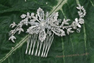 bridal comb is graceful and vibrant. Its flexible plate silver wire with rhinestones beads construction offers endless beautiful possibilities. Add your own personal touch on your special day, by shaping it to compliment your hair style. This designer comb headpiece measures approximately 3.5 x 2 inches, depending on the shape desired. This bridal comb coordinates with white and off-white wedding dresses.