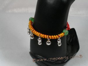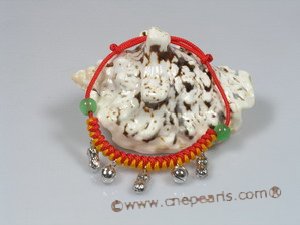 This teeny baby bracelet on a red adjustable cord measures 5" dangling with sterling silver fitting in the center, with two pieces 6mm jade beads as decoration;