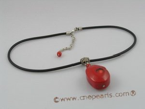 01.cn104 Red coral & cultured pearl rubber cord long necklace jewelry
