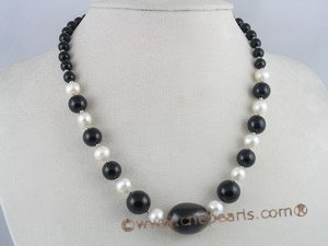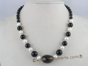 Handmade gem stone necklace consist of 10mm and 12mm round onyx, alternat with 7-8mm white potato shape pearl, set a a 22 mm faceted oval smoking quarts beads in the centren; with silver plated beads as spacer; end with silver plated or sterling silver lobster clasp and 16 inch in length; Also buy: Gem stone bracelets or Gem stone pendant& earrings