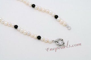 This Smart 4-5mm white pearl princess necklace features a 20mm ball designed agate pendant which is made of 6mm Black agate and hand knotted textured silk cord. decorated with 4mm and 10mm agate beads, 16inch in lenght and end with silver toned spring ring clasp. This accessory is perfect for any winter attire. The quoted price is for one piece 16inch princess necklace; | Designer White Potato Pearl and Crystal Princess Necklace | | Item No. | Lpn013 | Beads Size: | 4-5mm,4mm,6mm and 10mm