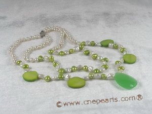 Elegant double strands necklace featured 5-6mm potato pearl, green side drilled potato pearl, alternated with white keshi pearl, decorated with oval shell beads, set a 30*20mm tear-drop crystal pendant in the centre; end with sterling or silver box clasp; 17-19" in length.