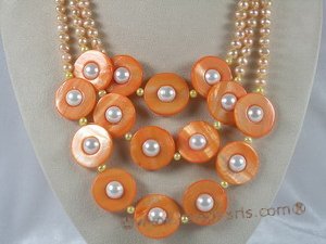 This elegant multi strands necklace is knitted with three rows 6-7mm pink potato shape fresh water pearl, decorated with 25mm orange shell and 10mm white sea shell pearl beads; end with silver clasp,The individual strand is 17"-20".