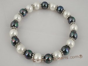 Black and white have always been a fantastic color combination, and this Stretchy bracelet is no exception. 8mm white and black south sea shell pearl are strung with silver spacers accent pieces; this pearl bracelet measures 7.5 inches and strung on stretch-cord to fit any size wrists!