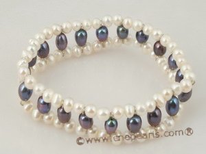 Dazzling cultured Pearl elastic bracelet knitted by elastic colloid wire with 4-5mm freshwater potato pearl combine with 7-8mm rice shape cultured pearl in the centre! 7.5 inch in length; The available color are: purple with white, white & purple, or white with black! Also buy:Summer jewelry collection or Single strand necklaces