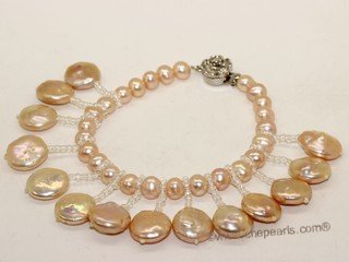 Handcraft freshwater pearl bracelet knitted with 6-7mm pink potato and 11-13mm pink freshwater coin pearl 7.5inch in length and end with silver toned flower clasp; This list price is for one piece 7.5inch pearl braclet; Also Buy:Freshwater pearl bracelets or Silver 925 pearls earring | Hand craft 6-7mm potato pearl and 11-13mm coin pearl bracelet | Item No.