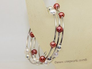 Freshwater  pearl bracelet made of 6-7mm freshwater potato pearl in white and wine red color, alternating with  copper silver tone pipe fitting. this pearl bracelet  total 22-24" in length can wear wrap as three row bracelet.