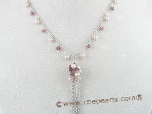 pn071 4-5mm potato pearl necklace with purple heart-shape crystal beads on metal chain