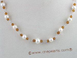 Charmming potato shape pearl necklace, alternately threaded with 7-8mm white cultured potato pearl and faceted crystal beads; ended with silver or sterling silver lobster clasp. The length is 16" and weight 25g.