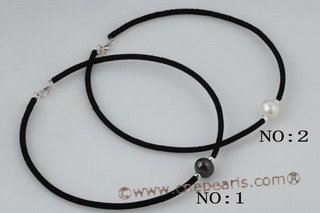 pn375 11-12mm single potato pearl and Black rubber cord necklace [one pearl necklace]  US$7.14