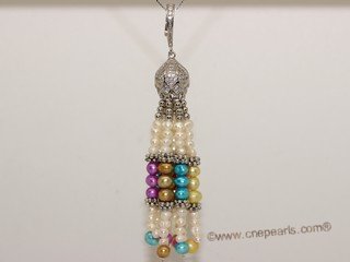 This tassel pearl pendant is suspended with a silver tone bail , it hung with 8 strand 48mm long tassel made with 3-4mm white potato pearls and 4-5mm mix color potato pearl , alternatived with silver tone fitting.a very classic pendant combining new and vintage materials.