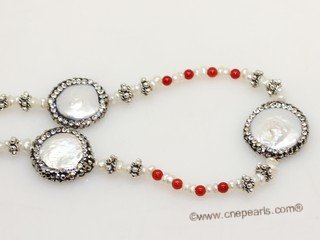 Hand knotted single string of 3-4mm button pearl and 3mm red coral combine with silver tone fitting set with 16mm freshwater coin pearl. it is a must have jewelry for any girl's jewellery box! 16inch in length and secures with a silver tone clasp.