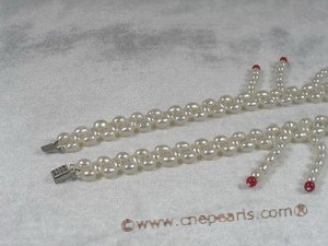 This hot selling bridal necklace set consist of a necklace and a pair of sterling earrings,the necklace knitted with 6-7mm white rice shape freshwater pearl by colloid lines, dangling with eleven rice pearl braids, with 5mm red round coral beads as decoration; end with silver or sterling silver box clasp and 17 inch in length;