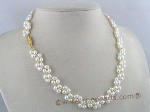 Handcrafted bridal necklace set Knotted with colloid lines, this set is composed of a necklace and bracelet, threaded with 4-5mm rice shape fresh water pearls with gild fittings in space; ended with gild clasp, Length is 17" of necklace and 7.5" of bracelet.