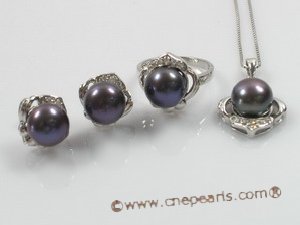 925silver pendant jewelry set featured 9.5-10mm black bread freshawater pearl combine with sterling silver mountting with zircon beads;you can choose different color: white, pink, purple or blacK; this set match with a pairs of sterling stud earrings and a 925silver rings(us size 7 ); This List price is for one piece sterling silver jewelry set include a 16inch sterling silver box chain;