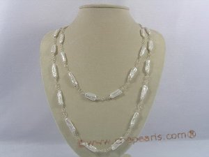 freshwater pearl rope necklace -- the long necklace is 36" in length with sterling lobster clasp,hand wrapped with good quality 7*18mm white biwa pearl,the pearls are lined randomly in the sterling chains,each pearl is adhere with 2 pieces sterling silver beads at both side.