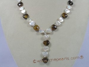 Fanshion keshi pearl necklace earrings set consist of a 16inch Y style necklace and a pairs of dangle earrings, This set hand wrapped with 10-11mm white heart shape keshi pearl alternated with 12mm tiger eyes gemstone, with sterling beads as spaces. sterling silver heart clasp completes the 16-inch pearl necklace Buy similar style necklace: sterling silver necklace or biwa pearl necklace or necklace jewelry set;