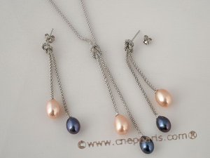 Elegant and modern pearl Pendant set featured 16inch sterling silver chain holds two pieces 7*9mm pink&black rice-shape freshwater pearls in a lariat necklace. matched a pairs of stud sterling dangle earrings complete the look. For pierced ears, A perfect Christmas gift;