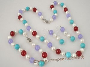 Elegant pearl jewelry set consist of a 16inch necklace,a 7.5inch bracelet and a pair of 925silver ear hook of dangle earrings, this set strung with 6-7mm white potato pearl, 8mm red&puple jade and 8mm round turquoise beads at regular intervals, with small silver beads in spaces; ended with 925 sterling or plated silver fish hook clasp;an unforgettable gift for you lover!