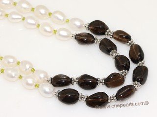 Hand-knotted 16-inch pearl double row necklace, Hand-selected with 8-9mm white rice pearl and 8*12mm smoking quartz bead , adorn with silver tone fitting, ended with a silver tone clasp; the jewelry set also matched with a 925silver Hook earrings for pierced ears complete the look! This list price is for one Piece 16inch necklace and a sterling sivler earring! | Two Rows Hand-knotted Freshwater Pearl and Gemstone Necklace Set | | Item No.: | pnset730 | Beads Size: | 8-9mm & 8*12mm | | Beads Type: | Freshwater rice pearl,smoking quartz
