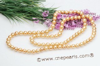 Elegant Round Shell Pearl Rope necklace strung by white thread, hand knotted with 10mm Golden color round mother of shell pearl, 48inch in length;An unforgettable gift for you lover! Hand knotted 10mm Golden Round Shell Pearl Rope Necklace