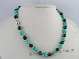Elegant looking green turquoise necklace strung with nugget green turquoise beads and 8mm balck agate beads at regular intervals, with silver beads in spaces; ended with 8mm 925 sterling or plated silver ball clasp as your selection. The length of necklace could be 16", 17", 18" or 20"; Alao buy other jewelry: Coral necklaces or Turquoise necklaces or Coral & Turquoise jewelry