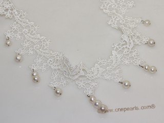 The exquisite Lace Bridal Choker Necklace is stylish necklace that handmade with lace and freshwater pearl, this bridal choker necklace in a beautiful floral pattern features an intricately hand-crafted white lace material that is embellished with 8-9mm and 6-7mm white potato pearl , it is about 16inch length end with silver tone clap with 2inch extend chain.